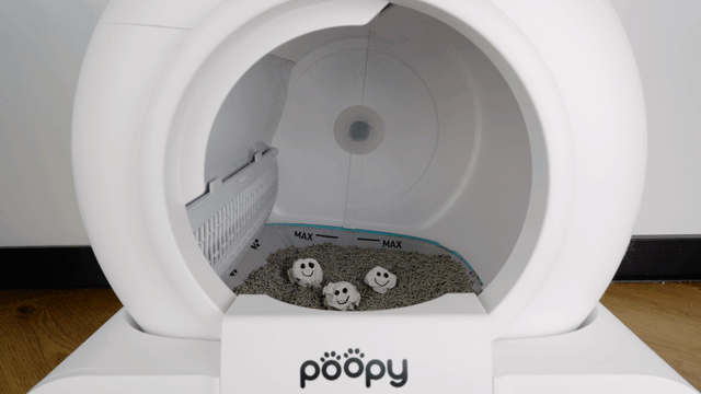 Poopy notices as soon as your cat goes in or out. You set after how many minutes cleaning starts. Safety sensors stop immediately if your cat comes back in.