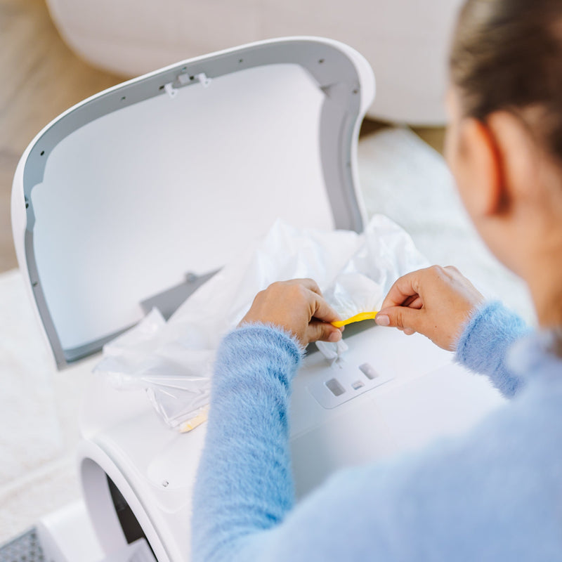 Button up the full bag and throw it away. Close the litter box and the Poopy Nano 2 is ready to use again.